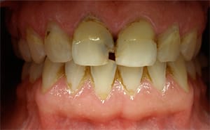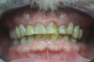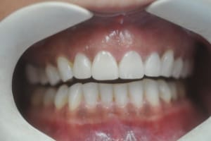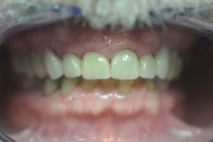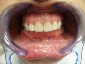 This nice lady had dark stains in her teeth that would not respond to any whitening treatment. She was also very nervous about having any un-reversable treatment done on her front teeth. We were able to give her the bright beautiful smile she wanted using very conservative preparations that would not make her teeth too sensitive. She is so excited about her new, clean and beautiful looking smile.